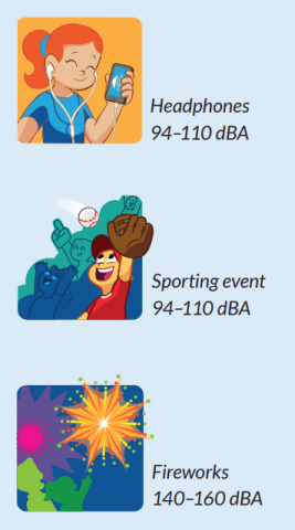 Many devices that children and teens use today (such as music players) create noise levels at or above 85 dBA. Fun activities such as playing musical instruments, going to concerts and sporting events, watching fireworks, and especially watching or participating in shooting sports can put you and your family at risk for hearing damage. Other loud noises such as ambulance sirens, leaf blowers, and farm equipment can also put you at risk.
