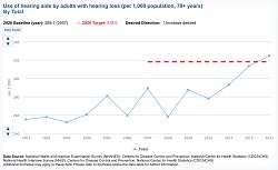 Reports on the Healthy People 2020 objective to increase the proportion of adults aged 70 years and older with hearing loss who have ever used a hearing aid.