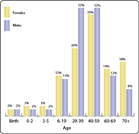 Percentage of males and females with tinnitus lasting at least three months, by age.