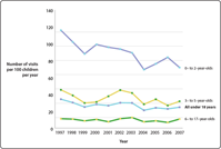 Yearly number of ambulatory care visits (per 100 children) that result in a diagnosis of otitis media, by age of the child patient.