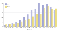 Number of hearing aids per 1,000 adults in 2006, by sex and age.