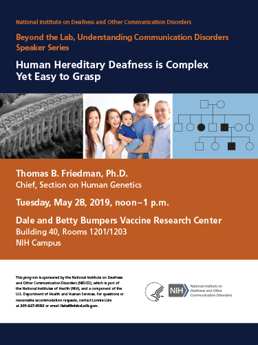 - What: “Human hereditary deafness is complex yet easy to grasp,” part of the NIDCD Beyond the Lab, Understanding Communication Disorders speaker series