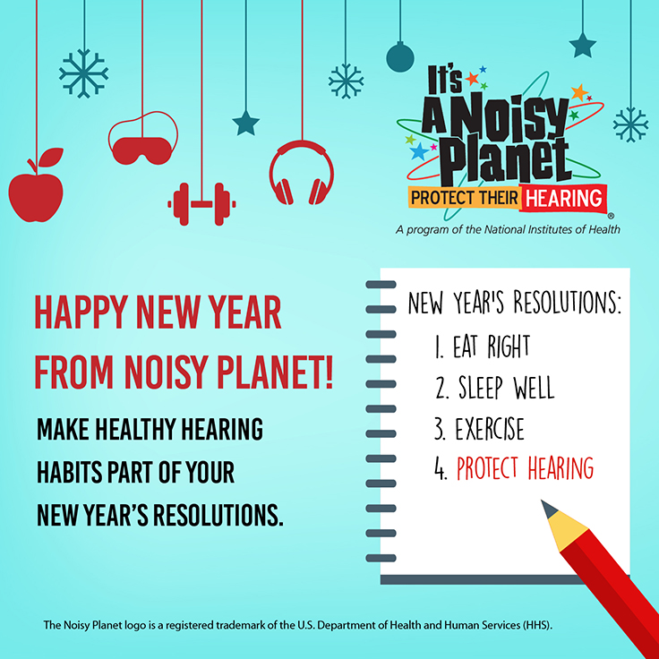 A cartoon spiral notebook and pencil with a to do list. To do list reads: New Year's Resolutions: 1. eat right, 2. sleep well, 3. exercise, 4. protect hearing. Text beside the notebook reads: Happy New Year from Noisy Planet! Make healthy hearing habits part of your New Year's resolutions. Across the top of the picture an apple, an eye mask, a hand weight, and headphones are hanging on strings.
