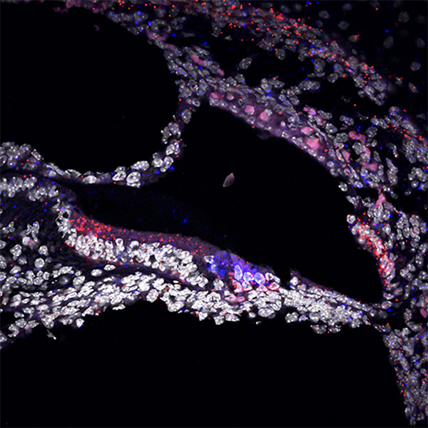 Confocal image of a row of sensory inner hair cells in red (TRIOBP-5 in green) from a shaker-2 mutant mouse.